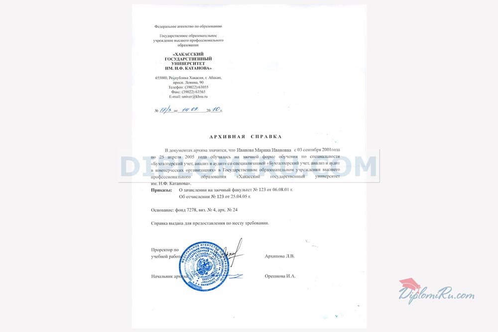 На нашем сайте Вы можете купить архивную справку для подтверждения факта вашего обучения в ВУЗе или ССУЗе. Справка изготавливается на обыкновенной бумаге формата А4, заполняется по стандарту или по образцу реально выданных в том или ином учебном заведении справок. За долгие годы работы мы накопили огромное количество таких образцов и готовы сделать их точную копию, но с Вашими данными. Печати и подписи соответствуют оригиналам. ВНИМАНИЕ СКИДКИ! В комплекте с дипломом высшего образования или среднего профессионального дешевле. Скидка по 2000 рублей на каждый документ при покупке 2х и более позиций.